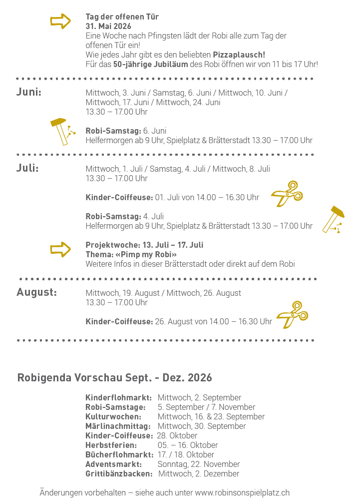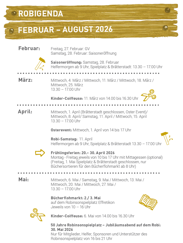 Du willst wissen, wann der Robi geöffnet ist und wann welche spannenden Events stattfinden? Dann hol dir unsere Agenda als Übersicht! Der Vorteil: Du hast die Termine jederzeit griffbereit und kannst sie mit anderen teilen 😊